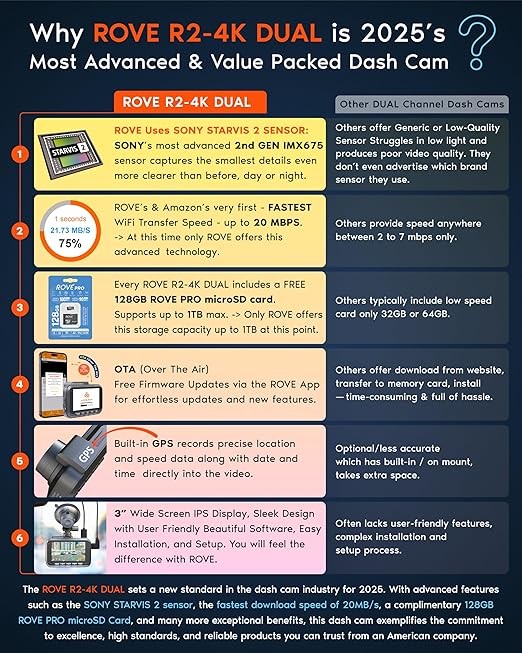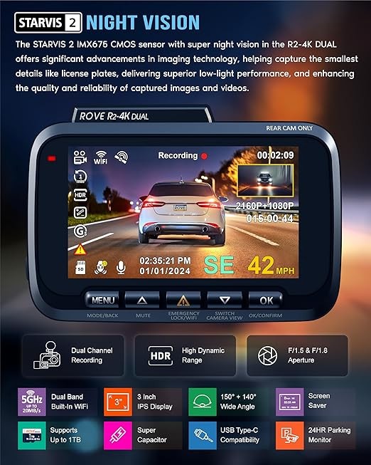 5G WiFi, Fastest Download Speed Up to 20MB/s, ROVE APP for iOS & Android, OTA (Over The Air) Firmware Updates, Built-In GPS for GEO Tagging, Live Speed, Supercapacitor for Higher Heat/Cold and Longer Product Life, Built-In Microphone, Speaker, Voice Guidance, 360° Rotation, 150°+140° True Wide Angle View, Free 128GB Memory Card Included, Up To 1TB External Storage Support, HDR (High Dynamic Range), SONY STARVIS 2 Sensor, 2024 Super Night Vision Low Light Capture Technology, 3" IPS Wider Display5G WiFi, Fastest Download Speed Up to 20MB/s, ROVE APP for iOS & Android, OTA (Over The Air) Firmware Updates, Built-In GPS for GEO Tagging, Live Speed, Supercapacitor for Higher Heat/Cold and Longer Pro…See more